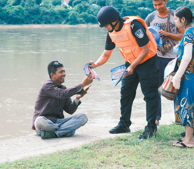 聯(lián)合巡邏執(zhí)法編隊(duì)執(zhí)法人員向沿岸民眾開展禁毒宣傳。