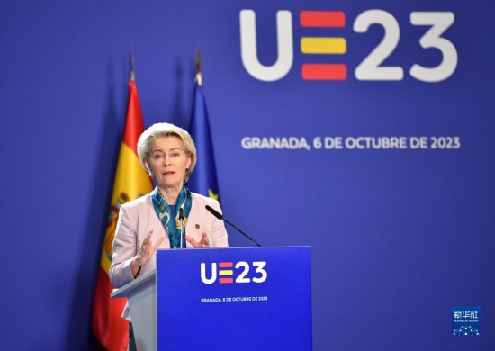 10月6日,在西班牙南部城市格拉納達(dá),歐盟委員會主席馮德萊恩在歐盟領(lǐng)導(dǎo)人非正式會議后舉行的新聞發(fā)布會上講話。新華社記者連漪攝