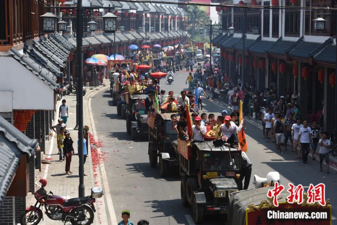 2015年4月3日,海南瓊海市萬泉鎮(zhèn)鬧“軍坡”車隊(duì)在墟鎮(zhèn)上巡游。蒙鐘德 攝