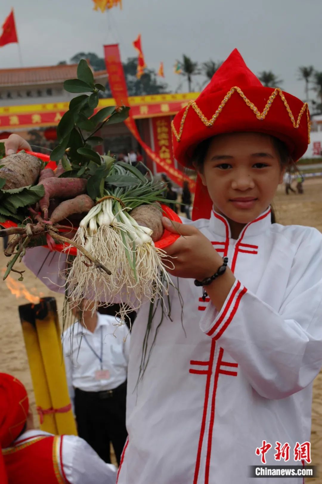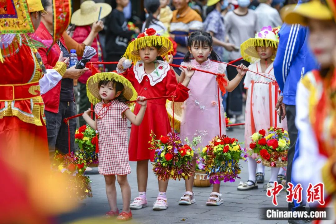 2023年2月28日,第二十二屆海口冼夫人文化節(jié)(原稱軍坡節(jié))之“裝軍巡游”活動(dòng)在海南??谛缕骆?zhèn)舉行。圖為在活動(dòng)中肩挑花籃的小女孩。駱云飛 攝