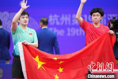 10月2日,杭州第19屆亞運(yùn)會(huì)乒乓球男子單打決賽在拱墅運(yùn)河體育公園體育館舉行,中國選手王楚欽4比3戰(zhàn)勝隊(duì)友樊振東,獲得冠軍。圖為王楚欽(右)與樊振東在賽后手持國旗向觀眾致意?!≈行律缬浾?田博川 攝