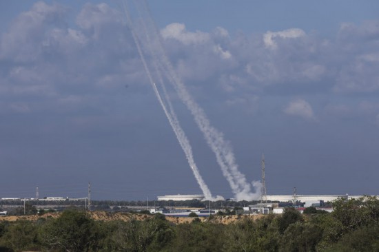 ↑10月7日,在以色列南部城市阿什克隆,以色列“鐵穹”防御系統(tǒng)發(fā)射導(dǎo)彈,攔截從加沙地帶發(fā)射的火箭彈。新華社發(fā)(伊蘭·阿薩亞格攝/基尼圖片社)