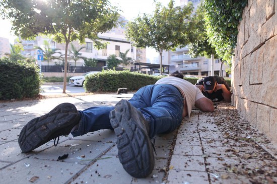 ↑10月7日,在以色列南部城市阿什克隆,民眾匍匐在地躲避火箭彈襲擊傷害。新華社發(fā)(伊蘭·阿薩亞格攝/基尼圖片社)