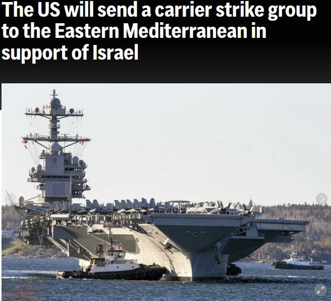 據(jù)美聯(lián)社報道,當天,美國國防部長奧斯汀發(fā)表聲明稱,他下令“杰拉爾德·R·福特”號航空母艦戰(zhàn)斗群移至更靠近以色列的東地中海,包括一艘航空母艦、一艘導彈巡洋艦和四艘導彈驅(qū)逐艦,以展示武力,準備應對任何情況,這些情況包括阻止更多武器送達巴勒斯坦伊斯蘭抵抗運動(哈馬斯)以及進行監(jiān)視。