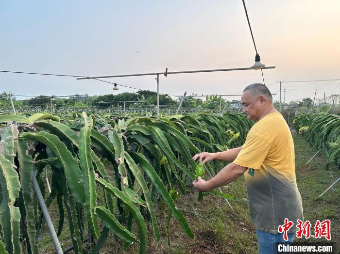 9月,臺胞曾鈞毅正在查看火龍果生長情況?!∴嵔?攝