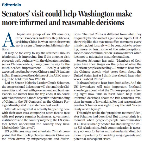 原文標(biāo)題:Senators’ visit could help Washington make more informed and reasonable decisions: China Daily editorial