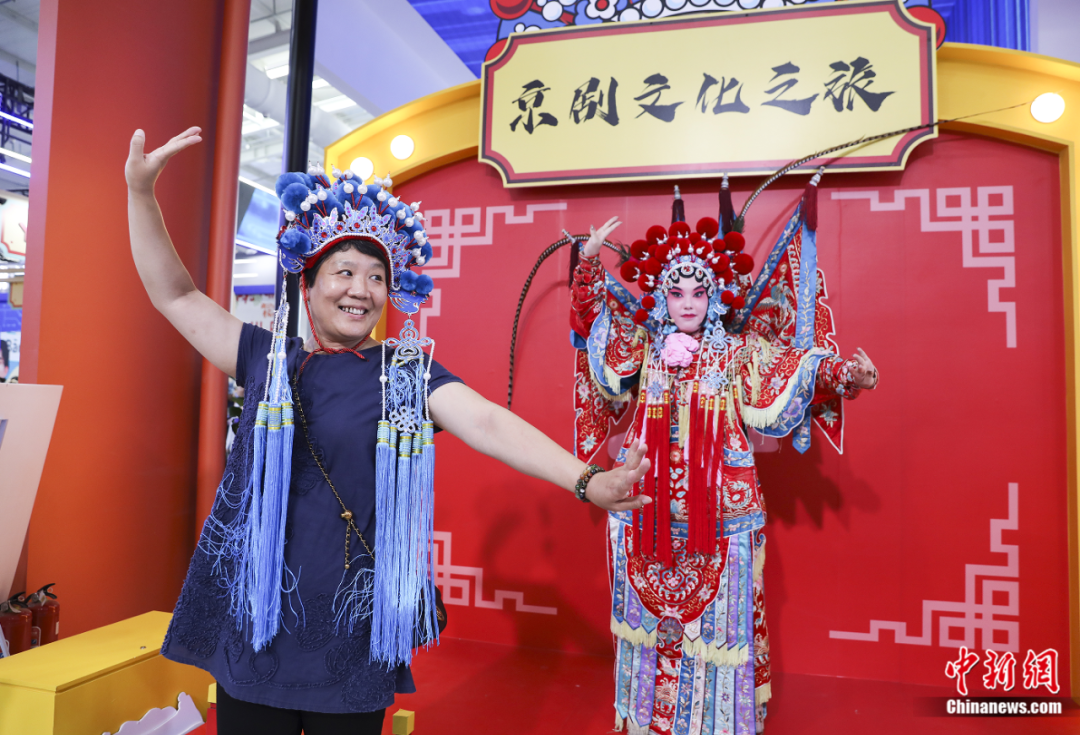 2023年中國國際服務貿(mào)易交易會(服貿(mào)會)在北京舉行,觀眾在首鋼園區(qū)“京劇文化之旅”展臺模仿京劇演員表演《穆桂英》片段。趙雋 攝