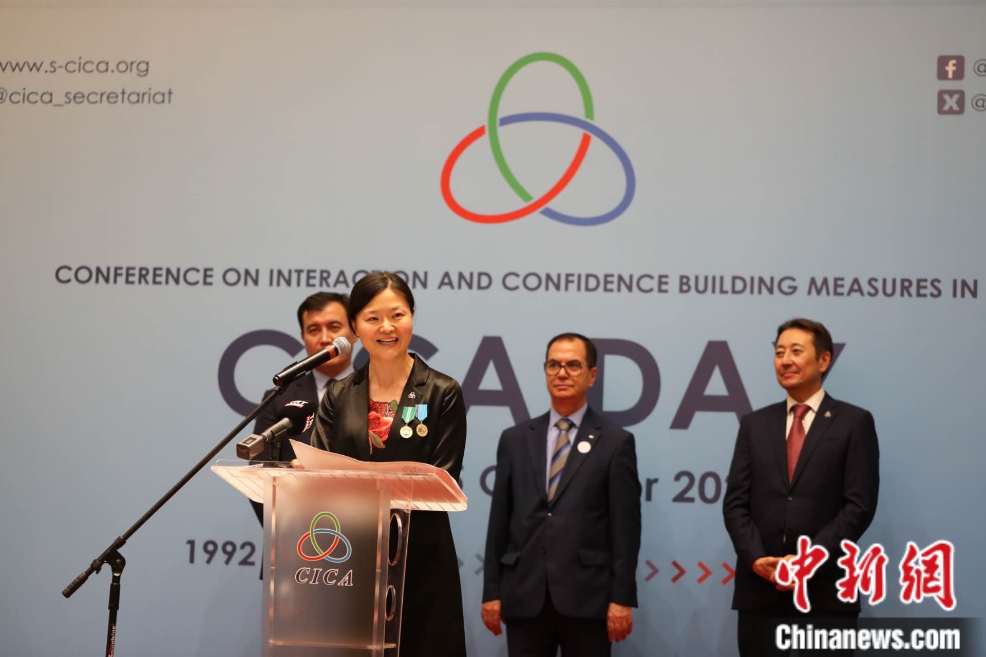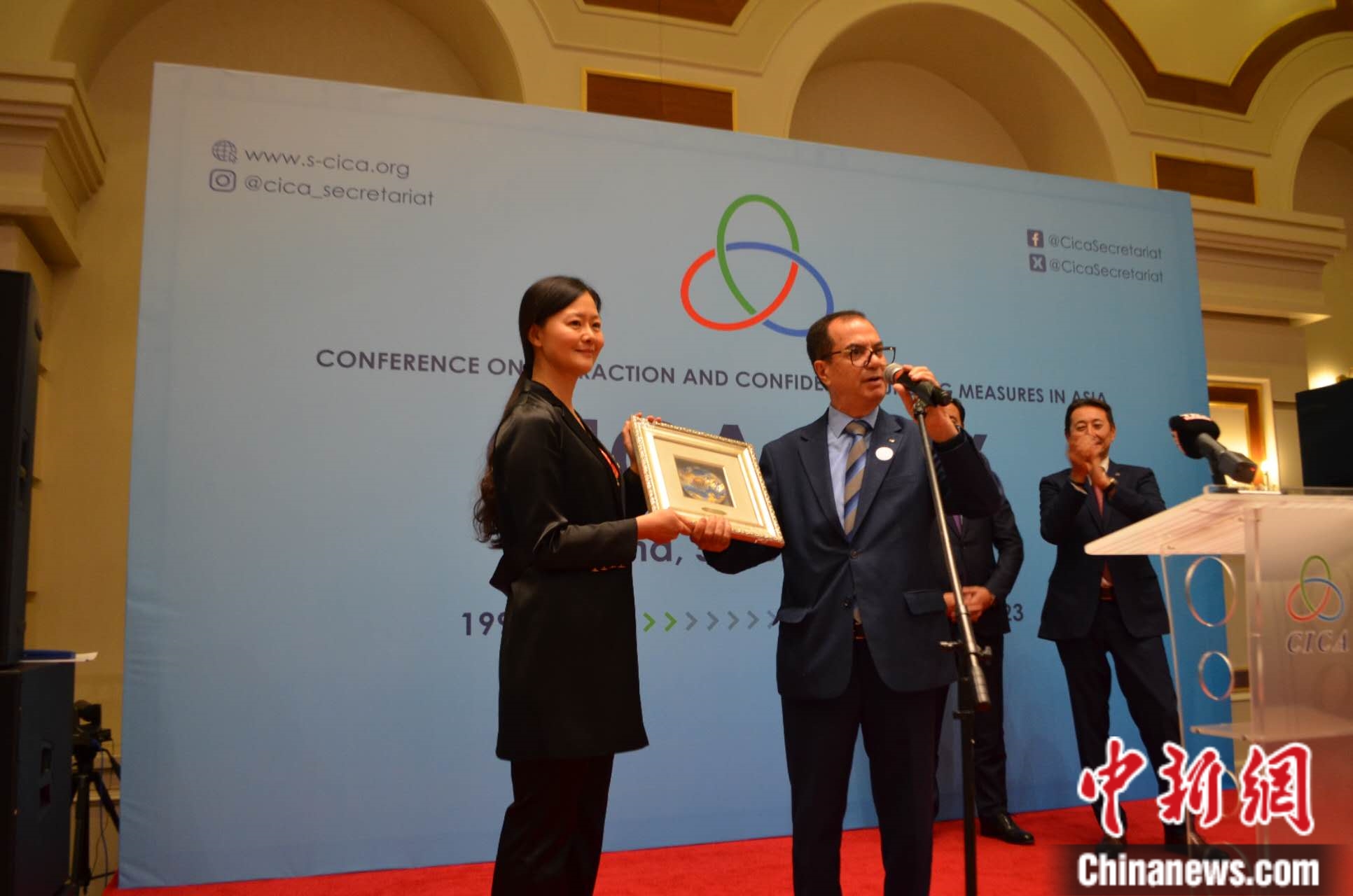 10月5日,哈薩克斯坦阿斯坦納,亞洲相互協(xié)作與信任措施會(huì)議秘書(shū)處舉辦成立31周年招待會(huì)。圖為亞信會(huì)議副秘書(shū)長(zhǎng)遲方被授予總統(tǒng)頒發(fā)的國(guó)家獎(jiǎng)?wù)?。亞信?huì)議秘書(shū)處供圖