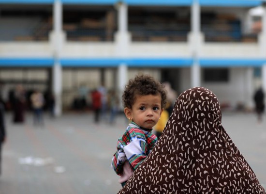 10月9日,一名婦女抱著小孩在加沙地帶南部城市汗尤尼斯的一所學(xué)校躲避以色列空襲。新華社發(fā)(亞西爾·庫迪攝)