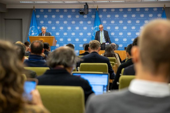 10月9日,在位于紐約的聯(lián)合國總部,聯(lián)合國秘書長古特雷斯(后左)在記者會上就巴以局勢發(fā)表談話。新華社發(fā)(聯(lián)合國供圖/保羅·菲爾蓋拉斯攝)