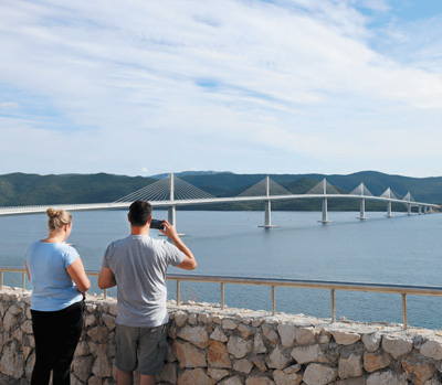 沿著克羅地亞狹長的海岸線一路向南行駛到科馬爾納地區(qū),遠遠就能望見如銀鏈般橫臥在山海之間的佩列沙茨大橋。在橋頭一側(cè)的休息區(qū),人們紛紛停下車來,對著大橋拍照留念。來自克羅地亞北部的卡塞爾和朋友們特地自駕來到這里,開心地請本報記者幫忙合影。“佩列沙茨大橋連通了克羅地亞南北領(lǐng)土,是我們心中最美的大橋!”卡塞爾說。