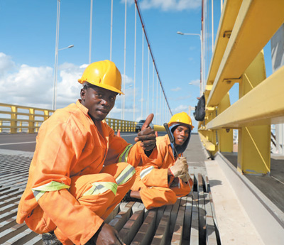 據(jù)介紹,馬普托大橋項目在建設(shè)過程中踐行屬地化經(jīng)營理念,建設(shè)最高峰期雇傭當?shù)貑T工超過3000人,焊工、車工、鋼筋工、機械操作手等一大批專業(yè)技術(shù)人員通過大橋項目提升了職業(yè)技能?!霸诖髽蝽椖可蠈W(xué)到的一技之長幫我找到了新的工作?!蹦1瓤饲嗄攴茽柕缕湛ㄕ劶霸隈R普托大橋項目工作的收獲,臉上洋溢著幸福的笑容。