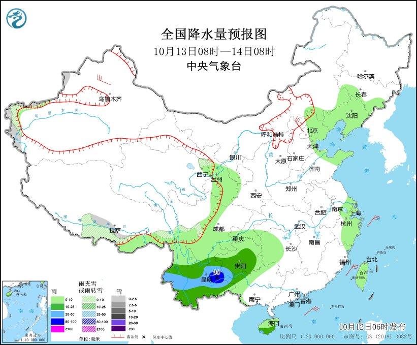 10月12日08時(shí)至13日08時(shí),西藏東部、青海北部和東部、甘肅西部、川西高原西北部等地部分地區(qū)有小到中雪或雨夾雪;西藏東南部、四川南部、貴州西部、云南中西部及海南島中東部等地部分地區(qū)有中到大雨,其中,云南西部局地有暴雨(50~60毫米)。西藏中部、四川盆地北部、河北北部等地部分地區(qū)有4-6級(jí)風(fēng);東海大部海域、臺(tái)灣海峽、臺(tái)灣以東洋面、巴士海峽、南海北部和中部海域、北部灣等海域有5~7級(jí)風(fēng)、陣風(fēng)8級(jí)。(見圖1)。