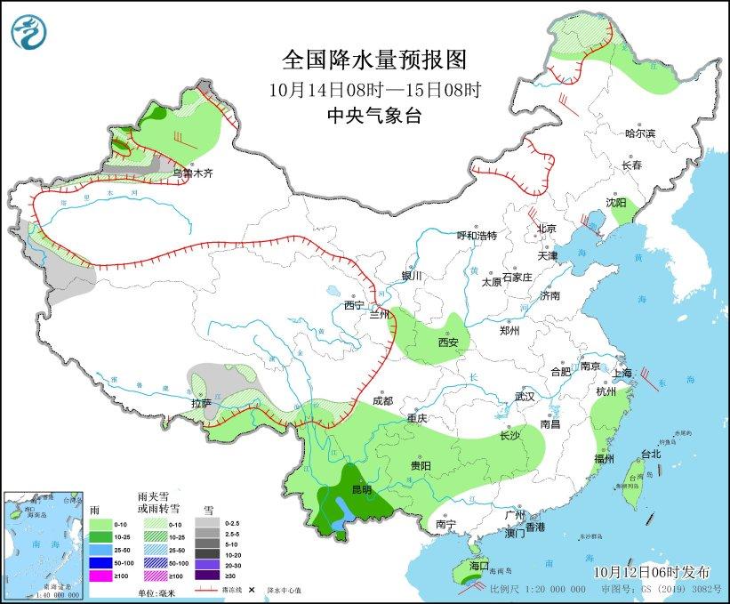 10月14日08時(shí)至15日08時(shí),內(nèi)蒙古東北部、新疆西部、西藏南部等地部分地區(qū)有小到中雪或雨夾雪;黑龍江西北部、遼寧東部、陜西南部、甘肅東南部、四川南部、貴州大部、云南、廣西西部、湖南中南部、江西西南部、浙江中東部、福建東部、海南島及臺(tái)灣島等地部分地區(qū)有小到中雨,其中,云南南部局地有大雨。內(nèi)蒙古東北部、新疆西北部、河北北部等地部分地區(qū)有5~6級(jí)風(fēng);渤海、渤海海峽等海域有6~7級(jí)風(fēng)、陣風(fēng)8~9級(jí)。(見圖3)。