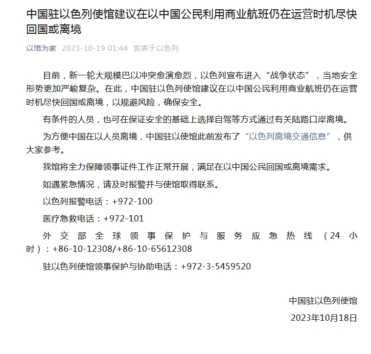 為方便中國在以人員離境,中國駐以使館此前發(fā)布了“以色列離境交通信息”。中國駐以使館將全力保障領事證件工作正常開展,滿足在以中國公民回國或離境需求。