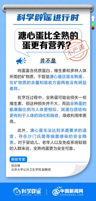 中新網(wǎng)10月20日電 溏心蛋和全熟蛋在礦物質(zhì)的含量和吸收方面沒有明顯差異。在烹飪過程中,全熟蛋可能會損失一些維生素,但這種損失并不大,而且全熟蛋的氨基酸比例與人體更相似,其蛋白質(zhì)結(jié)構(gòu)更有利于人體的消化和吸收。此外,溏心蛋無法達(dá)到殺菌要求的溫度,存在沙門氏菌等細(xì)菌感染的安全隱患。(來源:@科學(xué)辟謠 @中國新聞網(wǎng) )