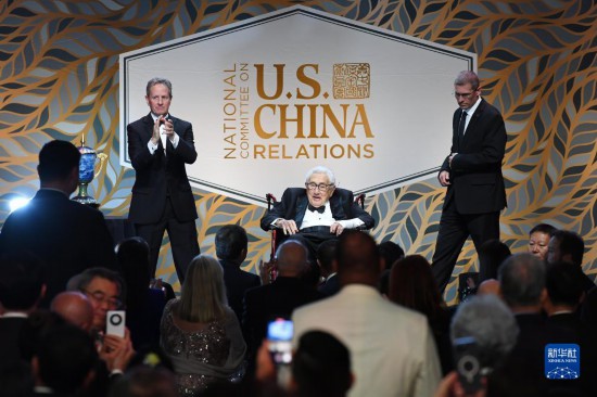 10月24日,美國前國務卿基辛格(中)出席在紐約舉行的美中關系全國委員會年度頒獎晚宴。新華社記者李睿攝