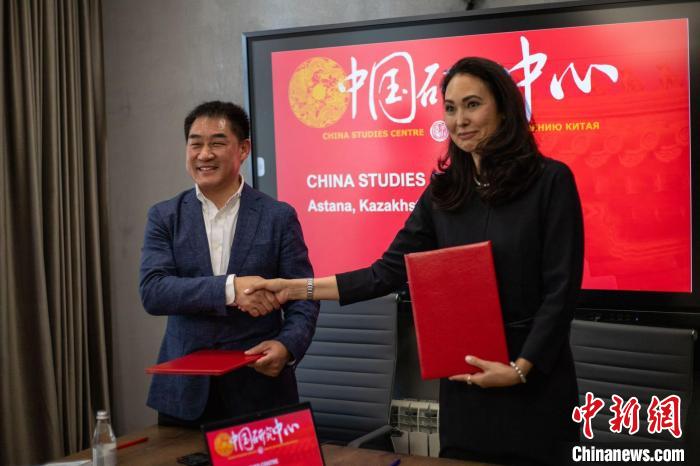 當(dāng)?shù)貢r(shí)間24日,哈薩克斯坦阿斯塔納,哈薩克斯坦中國(guó)研究中心主任古麗娜爾與上海交通大學(xué)醫(yī)學(xué)院院長(zhǎng)辦公室副主任童天朗簽署合作備忘錄。 主辦方供圖