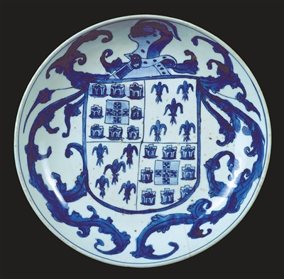 與此同時(shí),葡萄牙貴族開始向中國專門定制紋章瓷器。據(jù)博物館陶瓷收藏館館長拉斐爾·阿爾費(fèi)寧介紹,定制瓷器在葡萄牙的最早記載出現(xiàn)于1528年,即明代嘉靖年間。葡萄牙人非常珍視這些中國瓷器,甚至在返程途中給它們加飾銀制配件。由于當(dāng)時(shí)歐洲人多使用質(zhì)地粗糙的石制或陶制用具,設(shè)計(jì)獨(dú)特、淡雅脫俗且白皙光潔、能耐高溫的中國瓷器脫穎而出,備受珍視。當(dāng)時(shí),葡萄牙貴族多以中國瓷器為地位的象征,定制瓷器一時(shí)間蔚然成風(fēng)。其中,由葡萄牙阿爾布克爾克家族定制的瓷盤尤具代表性:盤心繪有盾形紋章,配以十字形盾牌和百合花,藍(lán)白相間,光潔細(xì)膩。這件瓷器珍品既是歐洲藝術(shù)史上的美麗篇章,亦是中葡藝術(shù)交融出的靈感結(jié)晶。