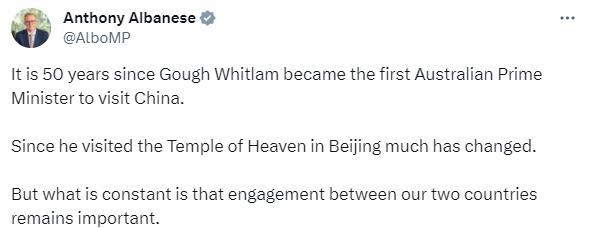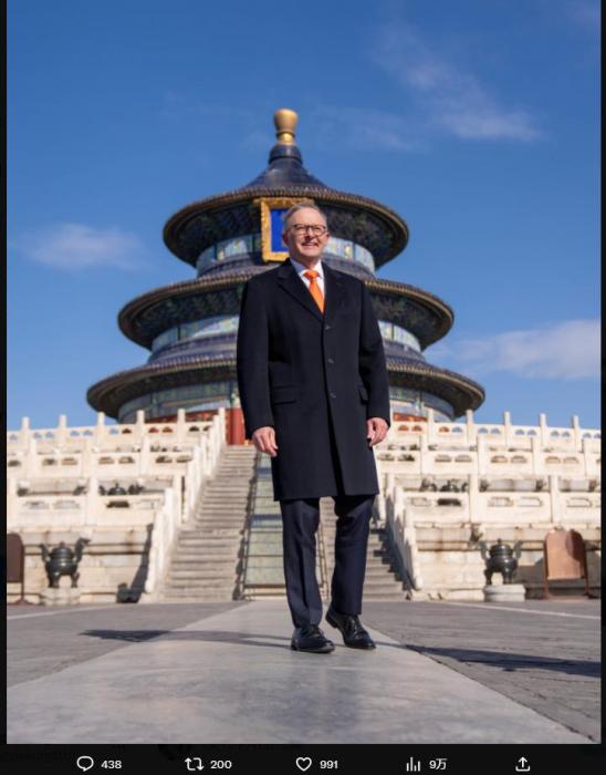 阿爾巴尼斯在社交媒體上發(fā)布了多張參觀天壇的照片,并發(fā)文稱,“50年前,高夫·惠特拉姆成為首位訪華的澳大利亞總理。自從他參觀北京的天壇以來,已經(jīng)發(fā)生了很大變化。但不變的是,我們兩國之間的接觸仍然很重要?!?/p>