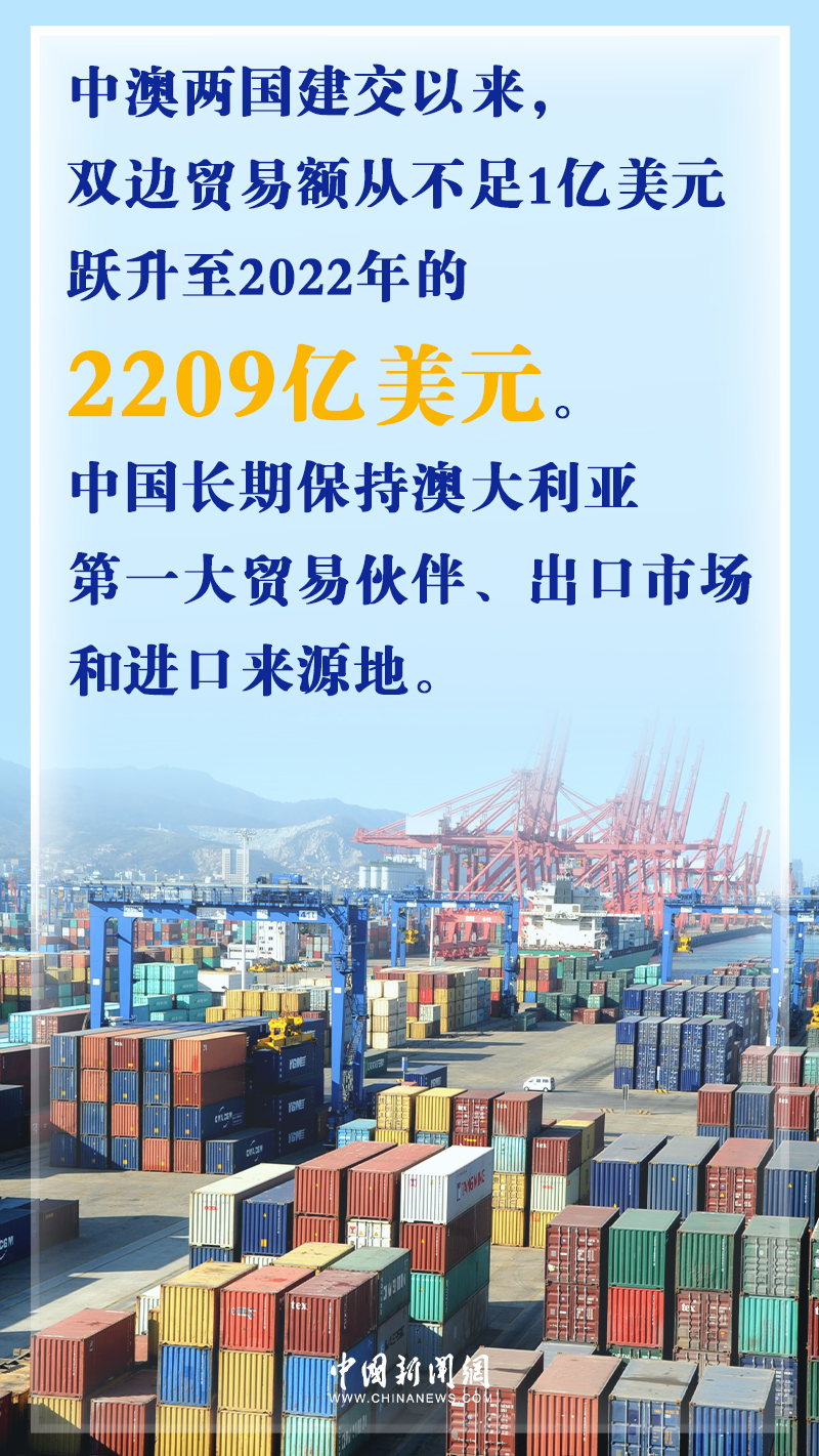 據(jù)中國駐澳大利亞大使館網(wǎng)站數(shù)據(jù),中澳兩國建交50年來,雙邊貿(mào)易額從當(dāng)時不足1億美元,躍升至2022年的2209億美元。中國長期保持澳大利亞第一大貿(mào)易伙伴、出口市場和進口來源地的地位。與此同時,越來越多的澳大利亞優(yōu)質(zhì)農(nóng)產(chǎn)品走進中國家庭,豐富了中國消費者的選擇。
