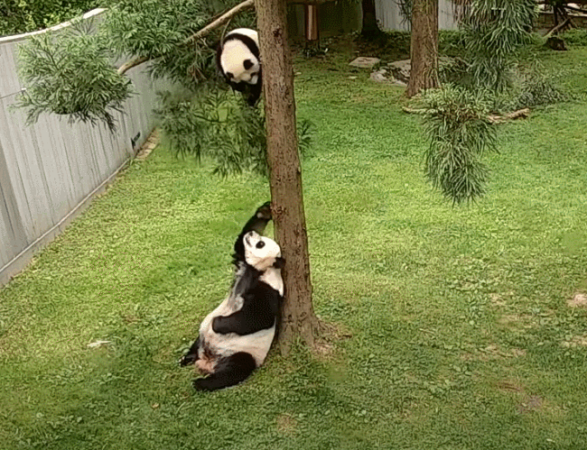 資料圖:“小奇跡”和“美香”在樹邊玩耍。來源:美國國家動物園社交媒體