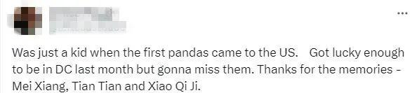有網(wǎng)友回憶起與大熊貓的點滴時說,“當?shù)谝慌笮茇垈儊淼矫绹鴷r,我還只是個孩子。上個月很幸運能前往華盛頓,我會想念它們的。謝謝你們帶來的回憶——美香、添添和小奇跡?!?/p>