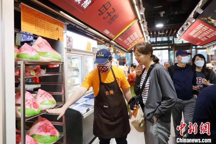 正式開張首日,各攤商早早地布置好店面。記者在市場一樓看到,立家湖州粽店的粽子等美食香氣四溢,購買民眾排起長隊(duì);合興糕團(tuán)店的巨大壽桃上有“福”“祿”“生日快樂”等字,吸引顧客拍照;大連食品店整齊擺著各類堅(jiān)果,并掛著湖南臘腸、廣東臘肉等熟食。