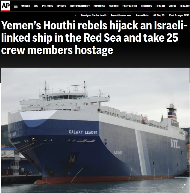 對此,以色列軍方表示,胡塞武裝扣押的并不是以色列船只,船上也沒有以色列人,而是一艘由英國所有、日本經(jīng)營的貨船,并譴責(zé)此事為“恐怖主義行為”。