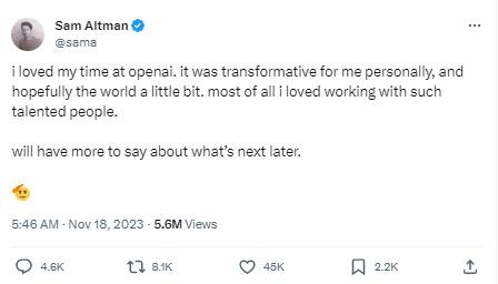 當(dāng)?shù)貢r間18日,奧特曼在社交平臺表示,“我很喜歡OpenAI的時光,這對我個人來說是變革性的,也希望通過重塑世界帶來一些變革。最重要的是,我喜歡與這些才華橫溢的人一起工作?!?/p>