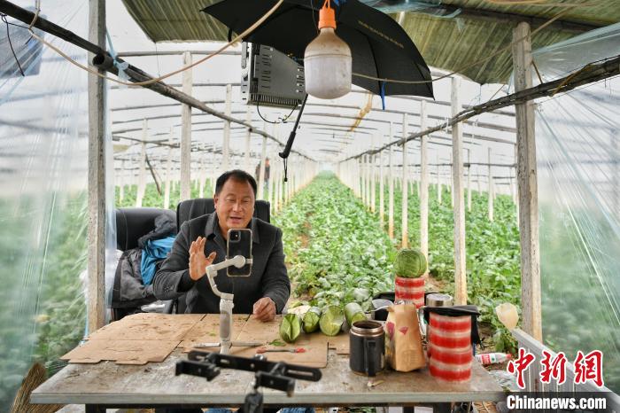 11月18日,在天津市西青區(qū)辛口鎮(zhèn)種植沙窩蘿卜的大棚內(nèi),農(nóng)民郭芝振通過手機(jī)直播推介沙窩蘿卜?!≈行律缬浾?佟郁 攝