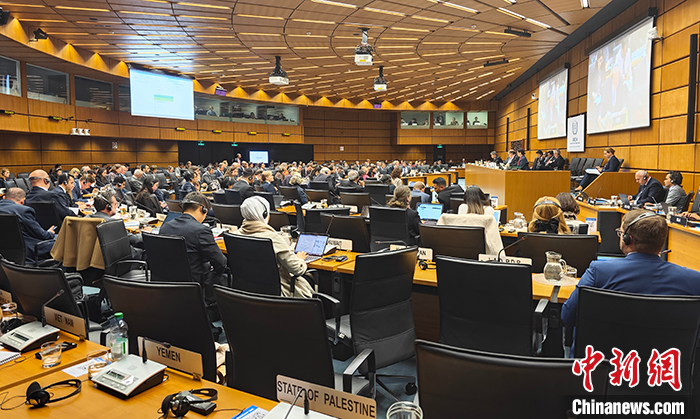 11月22日,中國常駐國際原子能機(jī)構(gòu)代表李松率團(tuán)出席在維也納召開的國際原子能機(jī)構(gòu)11月理事會(huì),就巴以沖突和以色列核問題發(fā)言。圖為會(huì)議現(xiàn)場(chǎng)。 中新社發(fā) 中國常駐維也納代表團(tuán)供圖