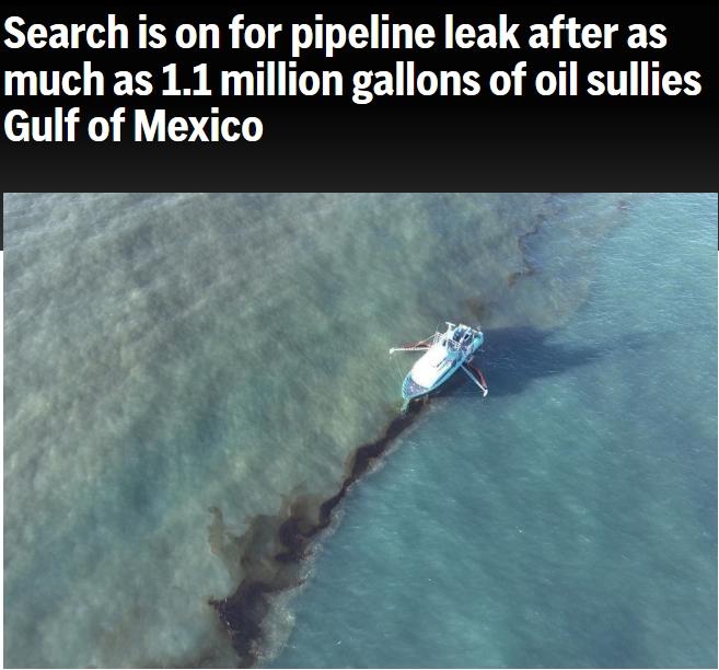 據(jù)報道,美國國家海洋和大氣管理局(NOAA)稱,當(dāng)?shù)貢r間16日上午約9點,在水面上發(fā)現(xiàn)了一層油膜,10分鐘后,第三海岸中游管道公司報告了管道泄漏。該機構(gòu)在網(wǎng)站上表示,當(dāng)天下午2點的一次報告顯示有3到4英里寬的浮油,“到處都是黑色的油”。