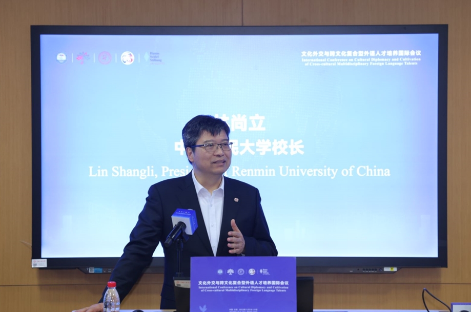 中國人民大學校長林尚立在會議開幕式致歡迎辭。林尚立表示,文化外交與跨文化復合型外語人才培養(yǎng)是語言類學科的必要之舉,此舉對未來人類的發(fā)展會愈發(fā)彰顯其重要性。林尚立認為,外語人才的培養(yǎng)應該具有文化感、哲學感,同時要加深對世界文化的了解,要有世界眼光,希望外語專業(yè)能夠培養(yǎng)出一批真正具有家國情懷、人類情懷,同時也具有豐厚人文底蘊的新一代文化人,培養(yǎng)出跨文化的文化外交者、跨文化的文化促進者。