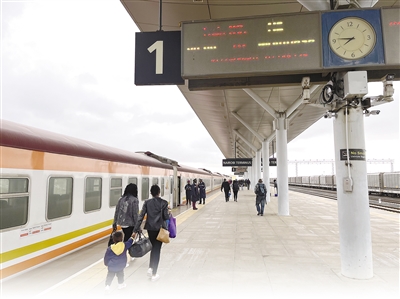 由中國路橋工程有限責(zé)任公司承建的蒙內(nèi)鐵路是肯尼亞獨(dú)立以來建設(shè)的首條鐵路,也是一條采用中國標(biāo)準(zhǔn)、中國技術(shù)、中國裝備建造的現(xiàn)代化鐵路,被譽(yù)為中國和肯尼亞共建“一帶一路”標(biāo)志性工程。圖為蒙內(nèi)鐵路列車??吭趦?nèi)羅畢站。