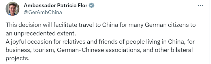 德國駐華大使傅融(Patricia Flor)在社交媒體平臺寫道:“這一決定將在前所未有的程度上為德國公民前往中國帶來便利。無論是在華的商務(wù)人士、旅游人士、德中協(xié)會以及從事其他雙邊項(xiàng)目的朋友,這都是一個(gè)歡樂時(shí)刻?!?/p>