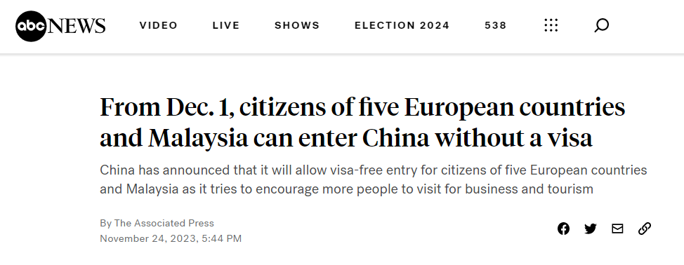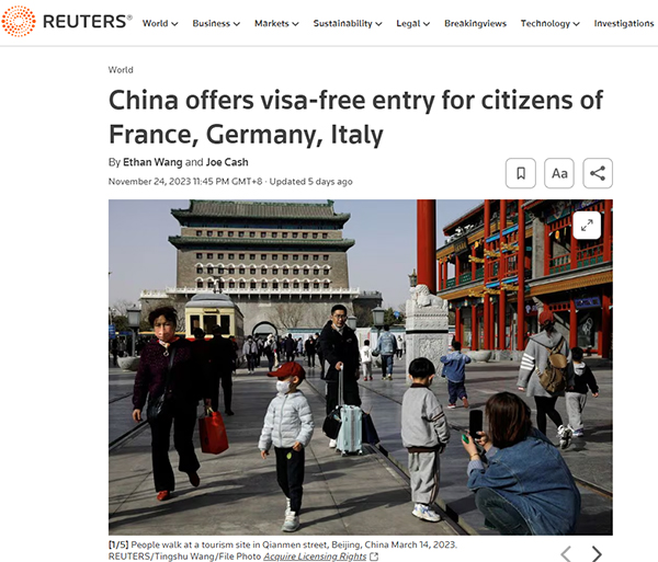 路透社報(bào)道稱,中國外交部宣布,2023年12月1日至2024年11月30日期間,上述國家持普通護(hù)照人員來華經(jīng)商、旅游觀光、探親訪友和過境不超過15天,可免辦簽證入境。