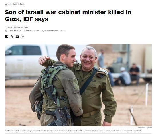 中新網(wǎng)12月8日電 綜合外媒報(bào)道,當(dāng)?shù)貢r(shí)間7日,以色列國防軍表示,以色列內(nèi)閣部長、前國防軍參謀長加迪·埃曾科特的兒子在加沙地帶北部的戰(zhàn)斗中喪生。
