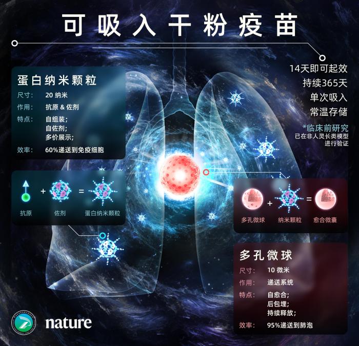 目前,這項(xiàng)研究已在實(shí)驗(yàn)室成功制備出新型干粉吸入式疫苗,并且在動(dòng)物模型上顯示出能夠高效阻斷呼吸道病毒的感染與傳播。北京時(shí)間12月14日凌晨,相關(guān)成果論文在國(guó)際著名學(xué)術(shù)期刊《自然》(Nature)上線發(fā)表。