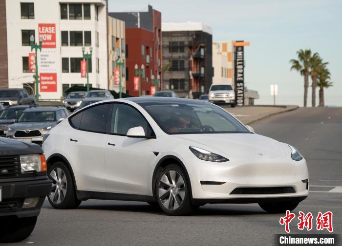 當(dāng)?shù)貢r(shí)間12月13日,特斯拉電動汽車駛過美國加州圣馬特奧縣一處路口。 中新社記者 劉關(guān)關(guān) 攝