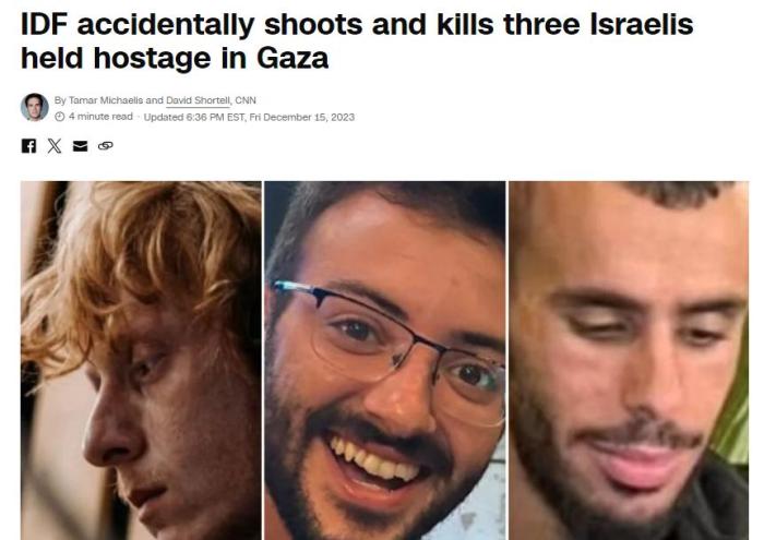 據(jù)美國有線電視新聞網(wǎng)(CNN)報(bào)道,以色列國防軍發(fā)言人赫格里在新聞發(fā)布會上表示,“在謝賈亞的戰(zhàn)斗中,以色列國防軍錯(cuò)誤地將三名以方人質(zhì)視為威脅。軍隊(duì)向其開火,他們被打死?!?/p>