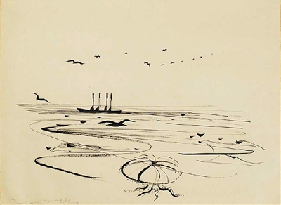 在人物肖像之外,萬徒勒里也熱衷于描繪中國(guó)山水。他于1954年創(chuàng)作的《長(zhǎng)江》借鑒了中國(guó)水墨丹青技法,整幅畫作視野開闊,體現(xiàn)出中國(guó)水墨畫的朦朧、婉約與詩意。他在客居瑞士期間的畫作同樣展現(xiàn)中國(guó)水墨畫開闊的構(gòu)圖、精巧的線條和獨(dú)具一格的東方美學(xué)。畫作《歸來》通過南飛的歸雁、孤寥的漁船和茫茫無盡的海面,讓觀者感受到一種難以訴諸語言、始終縈繞心頭的鄉(xiāng)愁。