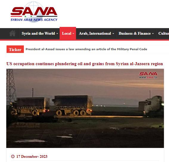 報(bào)道還稱,這是“美國在敘非法駐軍掠奪敘利亞國家財(cái)富系統(tǒng)性計(jì)劃的一部分”。