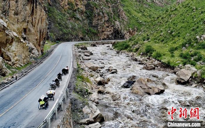 今年7、8月,康巴漢子在草原公路上滑動輪椅。扎西尼瑪 供圖