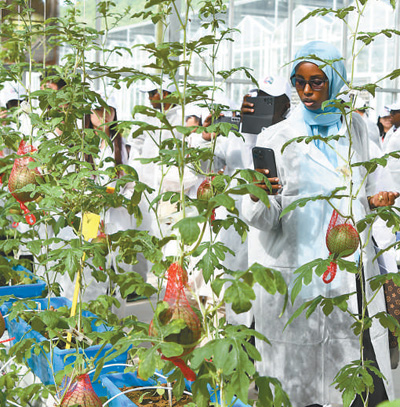 11月14日,參加中非農(nóng)業(yè)合作論壇的嘉賓在海南三亞市吉陽區(qū)大茅村的農(nóng)業(yè)科創(chuàng)中心參觀。