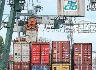 在德國多特蒙德港,機(jī)械設(shè)備在吊裝集裝箱。