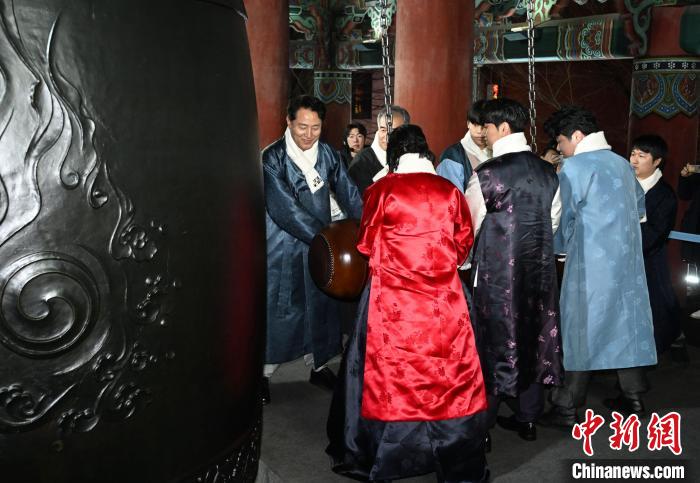 受疫情影響暫停的普信閣新年撞鐘活動時(shí)隔4年重新向市民開放。當(dāng)?shù)貢r(shí)間1日0時(shí),首爾市長吳世勛、公開推選出的12名市民代表和6名全球網(wǎng)絡(luò)紅人等22人分為4組撞鐘33次,宣布2024年的到來。