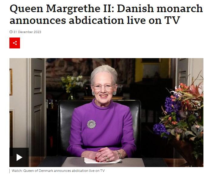 - 丹麥女王宣布將于1月14日退位