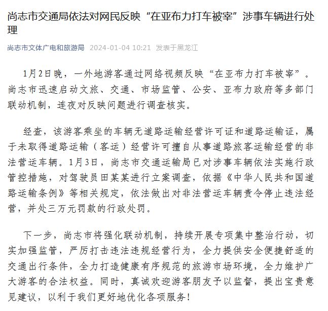 中新網1月4日電 據哈爾濱尚志市文體廣電和旅游局微信公眾號消息,1月2日晚,一外地游客通過網絡視頻反映“在亞布力打車被宰”。尚志市迅速啟動文旅、交通、市場監(jiān)管、公安、亞布力政府等多部門聯(lián)動機制,連夜對反映問題進行調查核實。