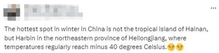 還有網(wǎng)友評論說,“中國冬天最熱的地方,不是海南島,而是黑龍江哈爾濱,盡管那里的氣溫會達(dá)到零下40攝氏度?!?/p>